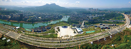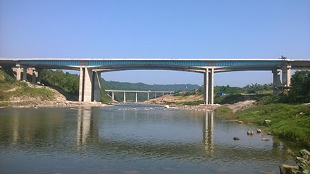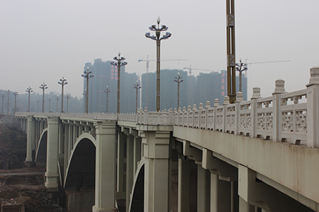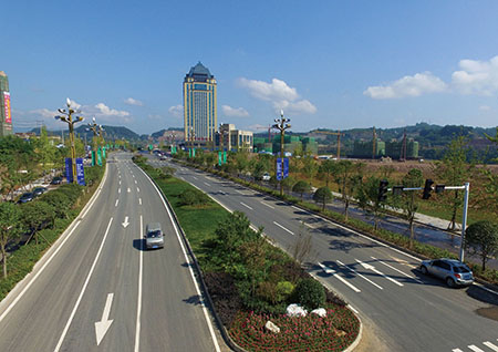 恩阳大道是恩阳区的城市主动脉之一,起于何家坝,经石硖子、马鞍山、文治山,跨之字河到曾家坝,止于巴南高速恩阳收费站附近米家山,全长9.54千米,路基宽度60 米,为双向6 车道,设计速度60千米/小时,工程投资11.83亿元。该项目具有山区市政道路的典型特征:地质条件复杂,作业面狭小,开挖难度大,与市政其他配套设施交叉作业。项目中的3座桥梁设计造型各具特色,技术含量高,施工难度大。其中两个控制性难点工程——之字河大桥和恩阳河大桥是最难啃的“硬骨头”。之字河大桥呈东西走向,长263米,宽36米,双向8车道,设计人行道宽2.75米,主桥与之字河成13°斜角,是一座集“坡、弯、拱”三大难点于一体的三跨上承式空腹混凝土拱桥。恩阳新大桥横跨曾家坝恩阳河,桥宽39米,采用左右两幅结构形式,主桥长294米,双向8车道,投资概算1.6亿元,是恩阳区一次性投入最大的单体工程。该桥设计为三跨波形钢腹板预应力混凝土连续梁刚构桥,在设计和施工中采用了多项新技术和新工艺,其中波形钢腹板的应用为西部地区桥梁建设首次使用,也是公司首次承建的钢—混组合桥梁。恩阳大道已于2016年12月完成交工验收并交付使用。