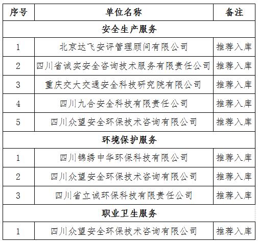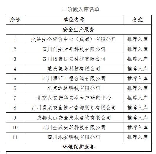 四川交投建设工程股份有限公司安全生产社会化服务项目两阶段招标已完成。评审小组通过对参选单位资质、业绩、报价与服务方案进行评审,确定中标候选人,现将入库名单公示如下: