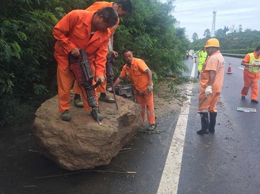 发现险情后,公司养护分公司第一时间向业主单位报告险情,并立即启动应急预案。由现场负责人就近紧急调派工人、机械赶往事发现场进行紧急抢险,并迅速做出处理措施:一是摆放标志标牌,警示车辆注意安全行驶;二是调集吊车、自卸车,工地钻机、发电机等器械对边坡淤泥、落石进行清理并运离现场;三是清理路面淤泥、将巨石碎小化,分批运离险情现场,确保交通的正常通行;四是将淤泥、落石清理完毕,重新恢复边坡、护栏防护设施,防止二次滑落。
