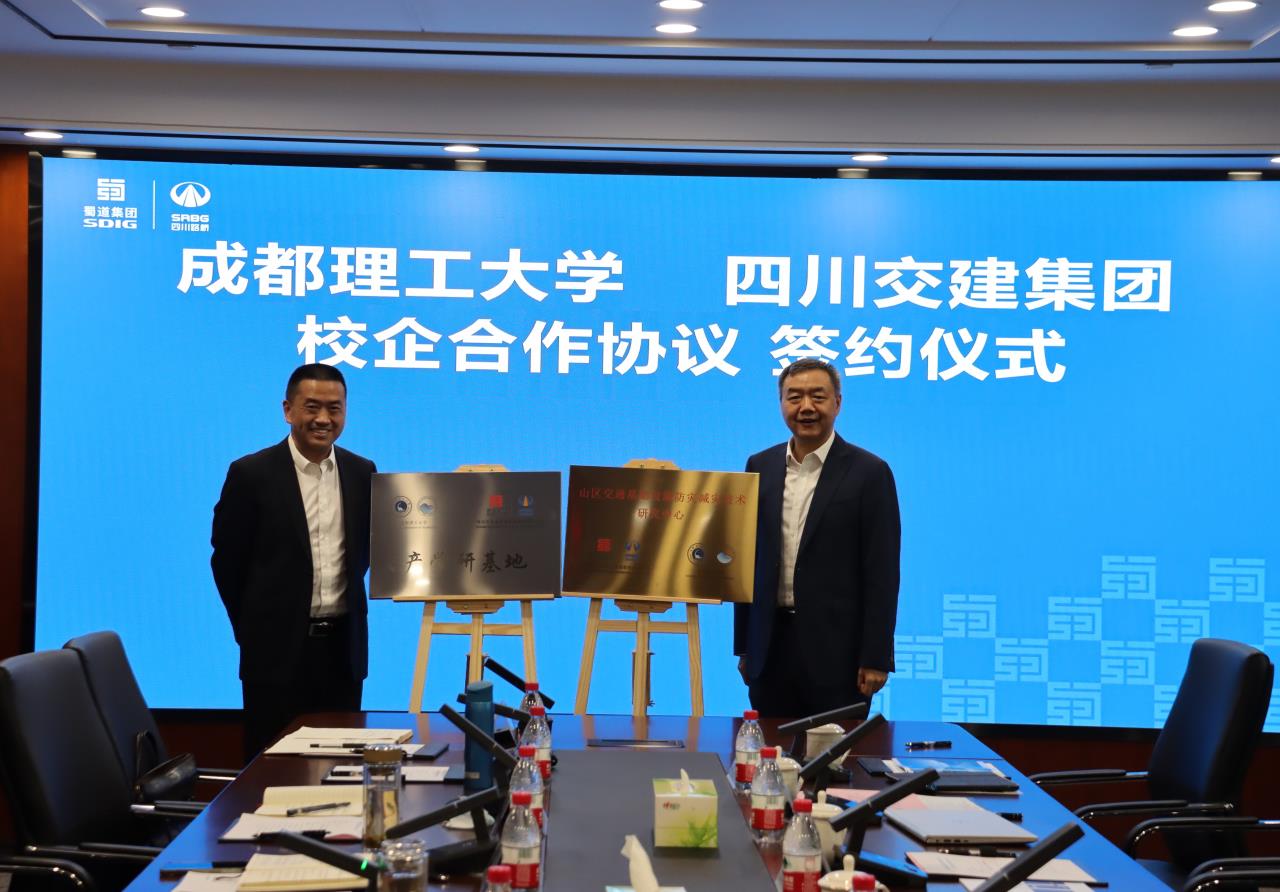 随后,交建集团党委副书记、副董事长、总经理章志高与成都理工大学环境与土木工程学院院长李天斌共同签订了校企合作协议。四川路桥党委委员,交建集团党委书记、董事长张航川与成都理工大学副校长巨能攀共同揭牌“山区交通基础设施防灾减灾技术研究中心”和“产学研基地”。