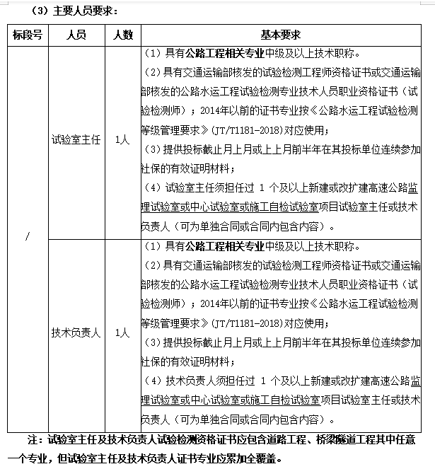投标人可提供备选试验室主任(面试通过)1名,但不作强制要求。未通过或未参与现场考核的主要人员,不得在本项目担任职务。如果在评标过程中发现投标人投标文件中拟投入本项目试验室主任和技术负责人与面试人员不一致,直接按无效投标处理。